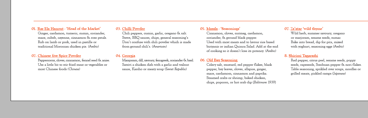 Keeping the number of grids to a minimum has proved an effective tool of organising text, the grid is split into 10 columns allowing two paragraphs / headers of text into each allowing the 20 pre mixed spices to be divided equally.